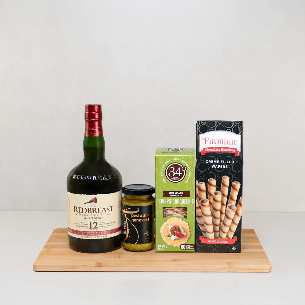 Bottle of Whiskey (750ml): This basket includes a 12-Year-Old Single Pot Still Irish Whiskey full bottle of triple-distilled whiskey, matured in sherry and bourbon casks, with notes of apple, raisin, vanilla, oak, and warm spice for a smooth, memorable finish.